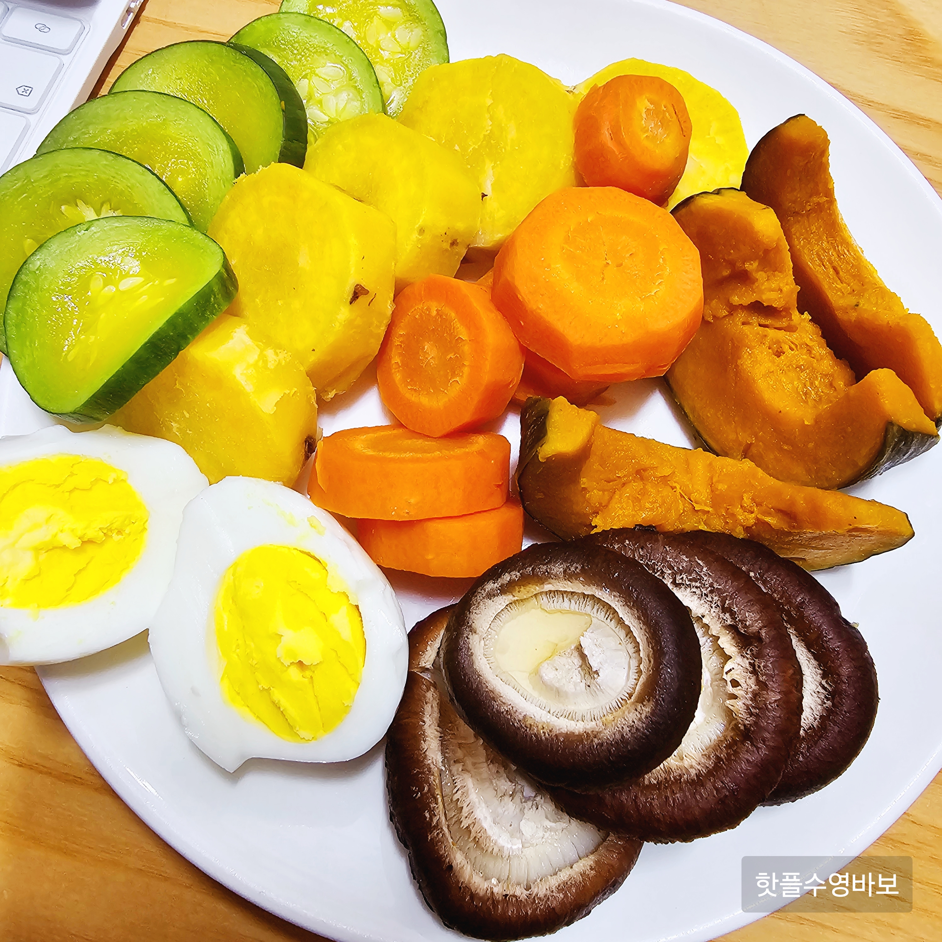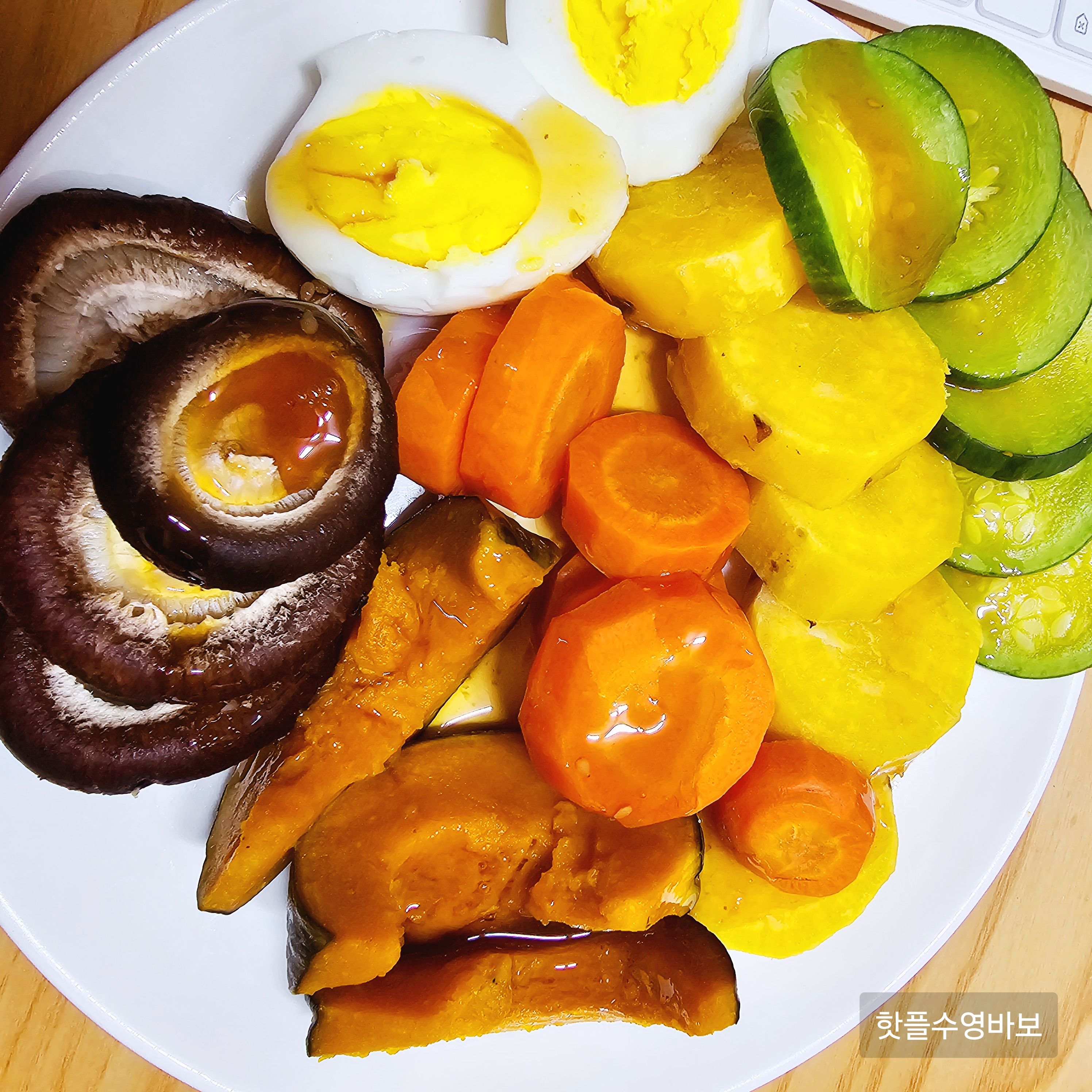 계란은 바로 쪄서 바로 먹는 거라 따끈하니 너무 맛있었어요 단호박은 단맛이 제일 강한 야채라 양상추처럼 쌈채소와 같이 먹으면 잘 어울리는데 다른 야채완 그냥 비슷한 느낌이에요